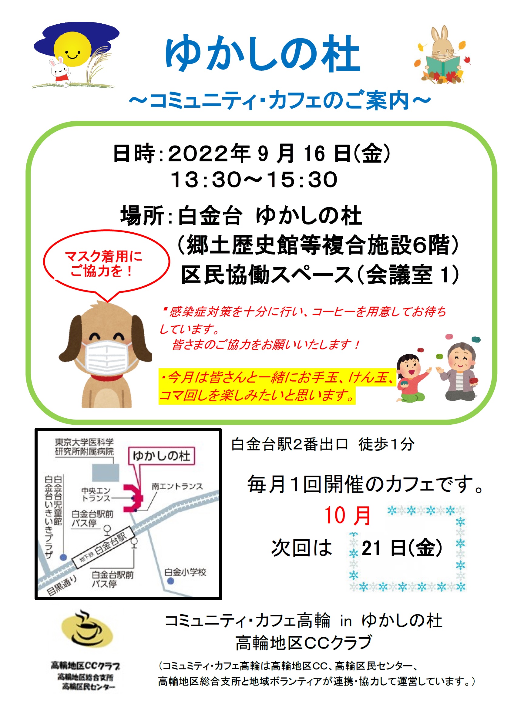 コミュニティ・カフェ高輪 in ゆかしの杜 9/16開催で、今月は昔遊びを用意しています。(高輪地区CCクラブ)