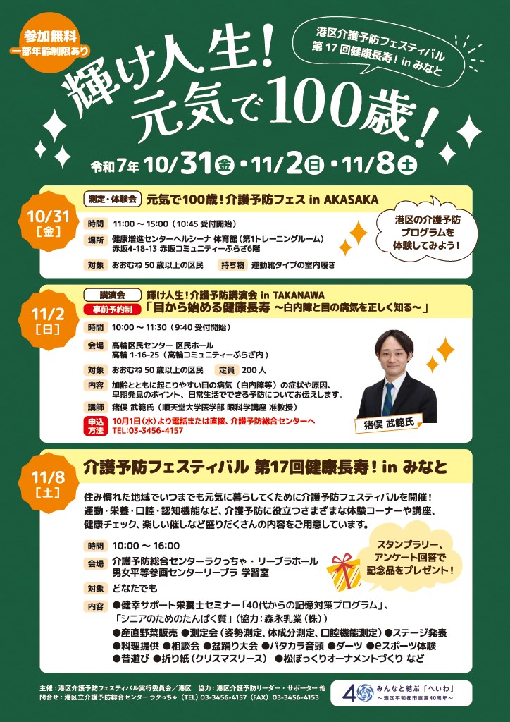 港区介護予防フェスティバルのご案内 10月31日(おおむね50歳以上の区民) 11月2日(事前予約制 おおむね50歳以上の区民) 11月8日(どなたでも)