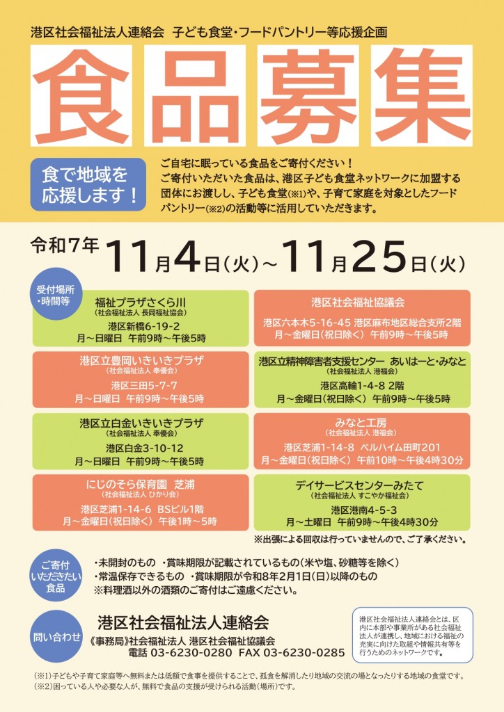 子ども食堂・フードパントリー応援企画 港区社会福祉法人連絡会として、ご自宅に眠っている食品の寄付を募ります。11月4日~11月25日にチラシに掲載している8か所で受け付けます。