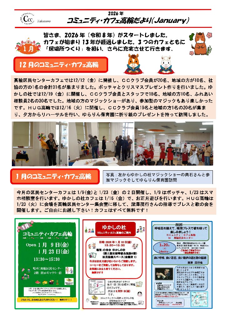 高輪だよりとカフェのご案内!1月のカフェの予定も掲載 今月の HUG高輪は高輪区民センター集会室 すべてカフェは無料!