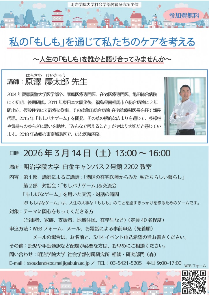 明治学院大学社会学部付属研究所主催 講話と対話会 私の「もしも」を通じて私のケアを考える 3月14日(土)13:00~16:00 事前申込制